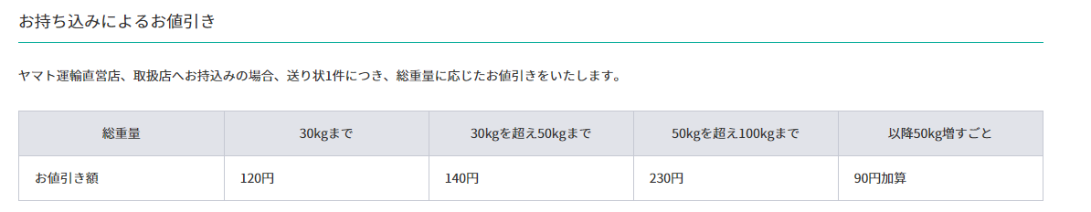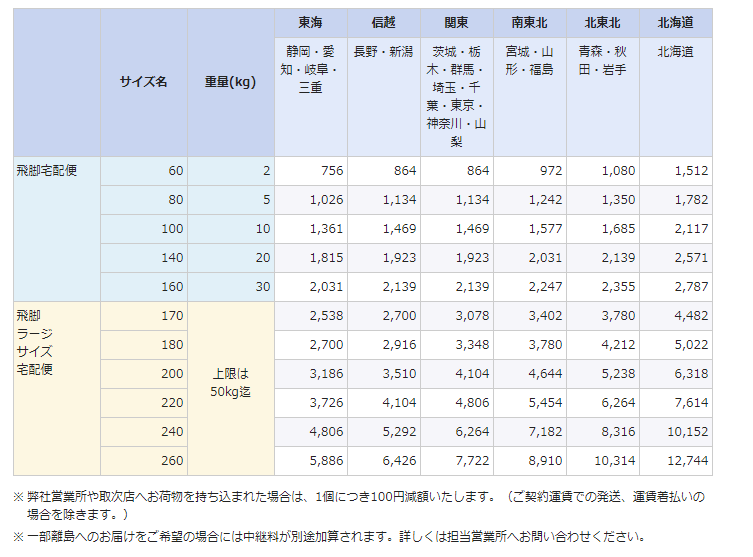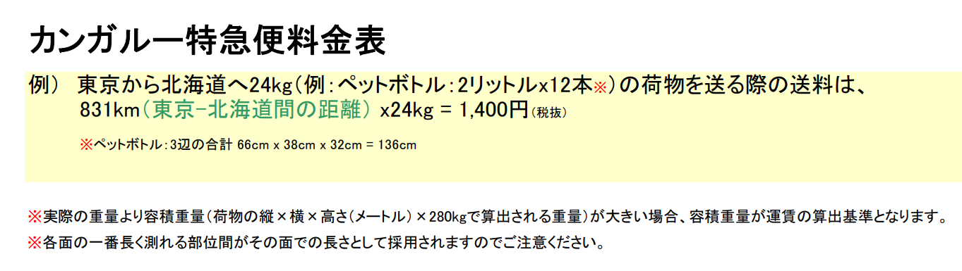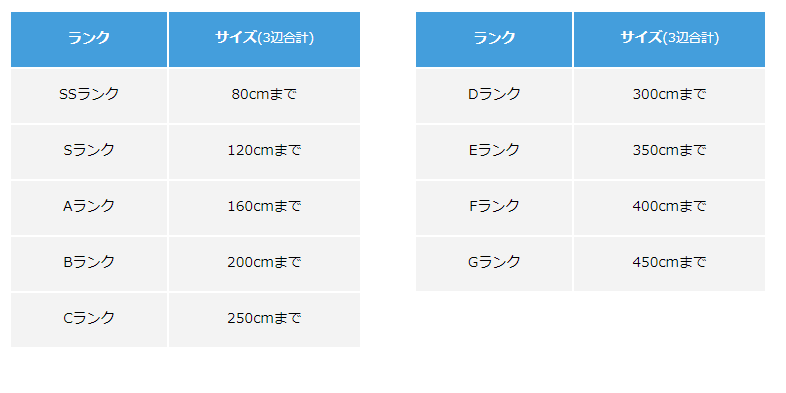 荷物の運賃は、サイズまたは重量で計算された運賃で大きいほうを適用します。