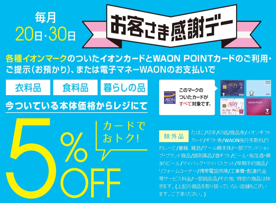 毎月20日、30日は「お客さま感謝デーの5%割引特典」と