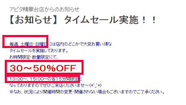 タイムセールは各店舗それぞれ行う時間が違い