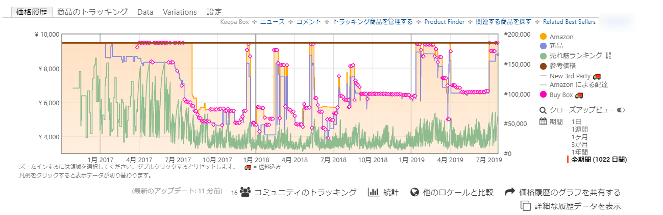 例えば、この商品ですが、Amazonの価格の推移に対し、