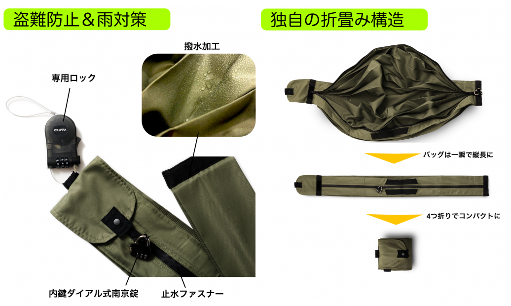 OKIPPA専用ロックと内鍵として南京錠が付属します。専用ロックのセキュリティワイヤーは、