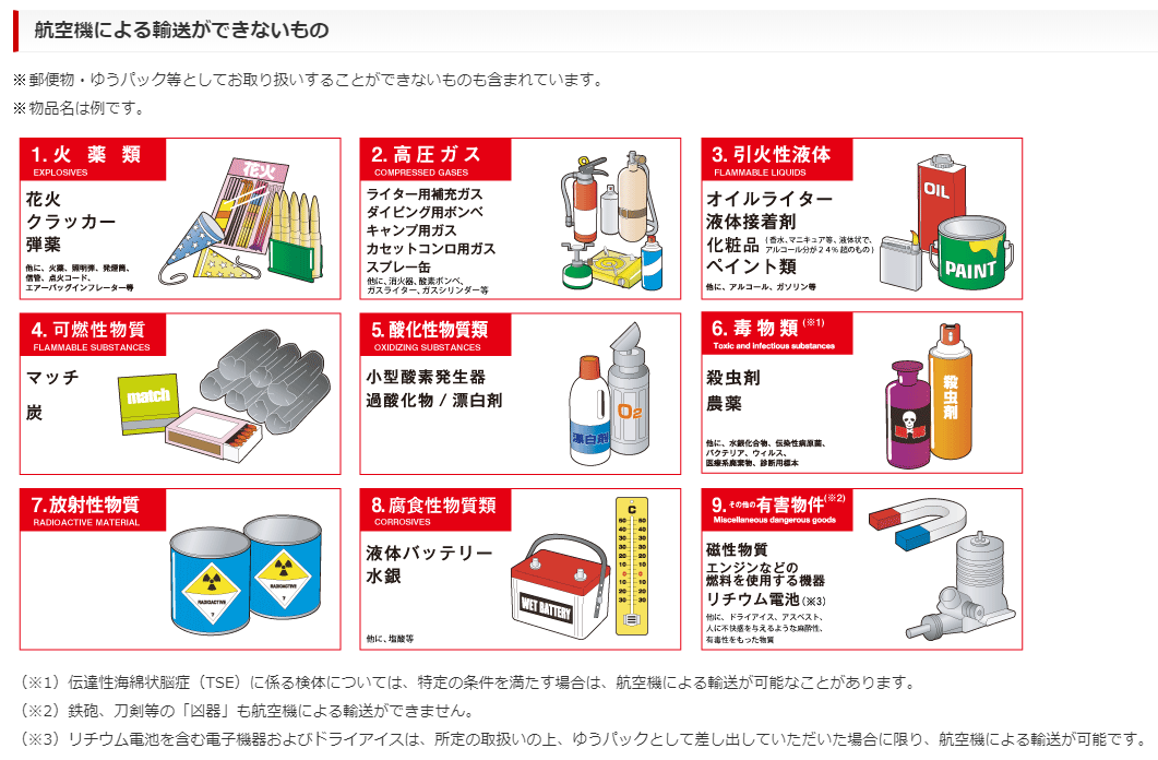 ・日本郵便で航空機による輸送ができないもの