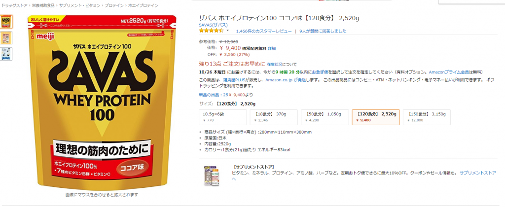 「ザバス ホエイプロテイン100 ココア味 2520g」の