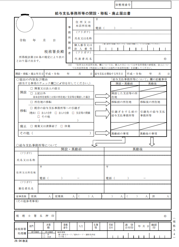 →国税庁ホームページ 給与支払事務所等の開設・移転・廃止の届出