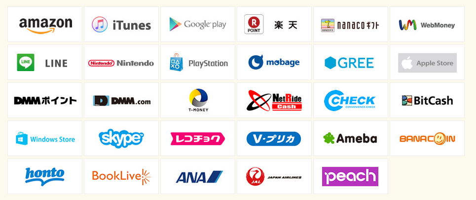 ギフトカードは、楽天スーパーポイント、Google Play Card、App Store & iTunes Card以外にも、