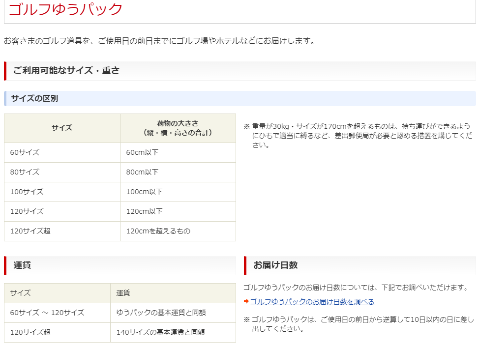 (※「ゴルフゆうパック」の長さの最大限は、150cm以下)