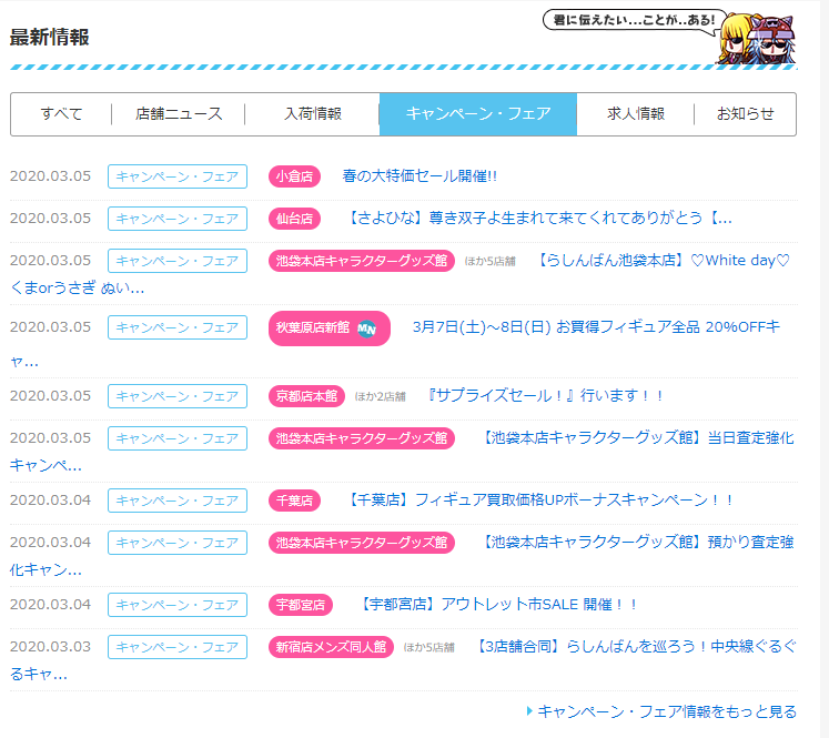らしんばんの公式サイトの「店舗ニュース」や「キャンペーン・フェア」一覧からも、セール情報やお得な情報を知ることができます。