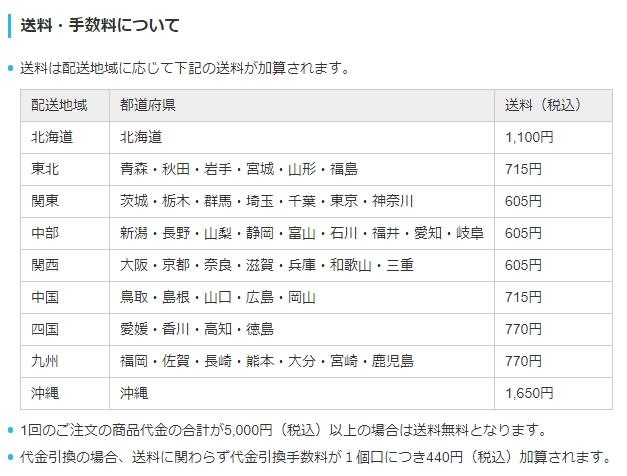 らしんばんオンラインでは、地域によって送料が違います。