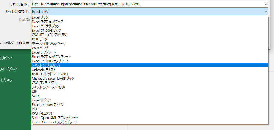 「テキスト(タブ区切り)」形式で保存してください。