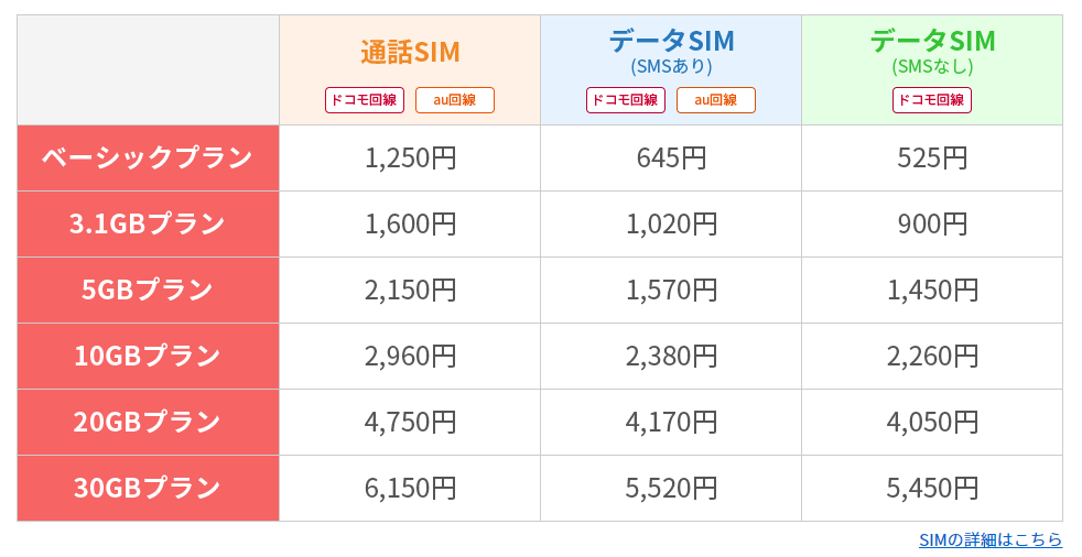 最安のシム契約で1250円。