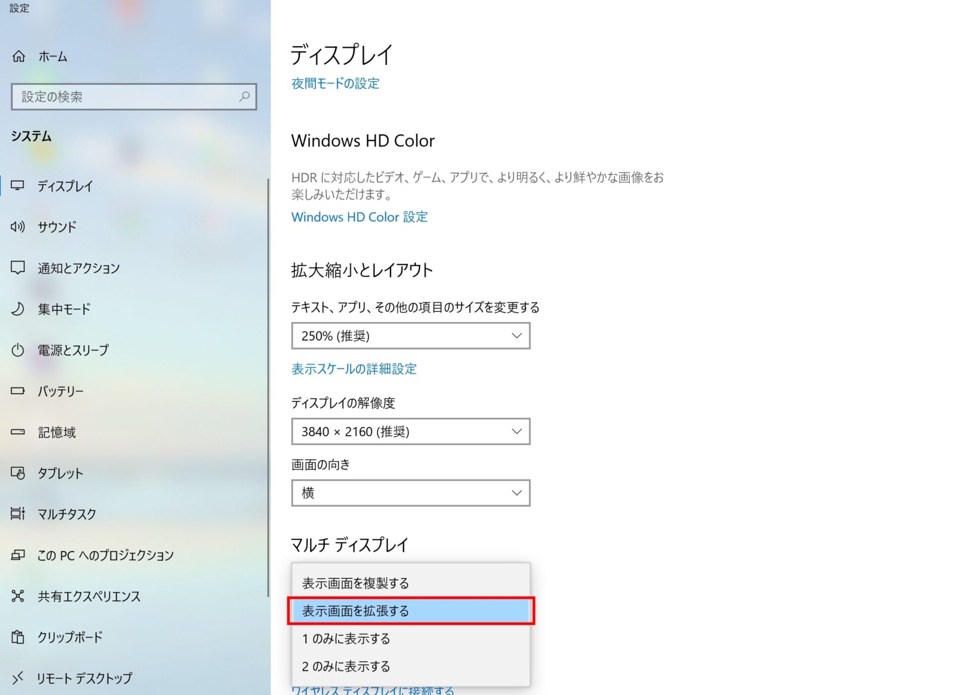2.「マルチディスプレイ」設定から「表示画面を拡張する」を選択します。