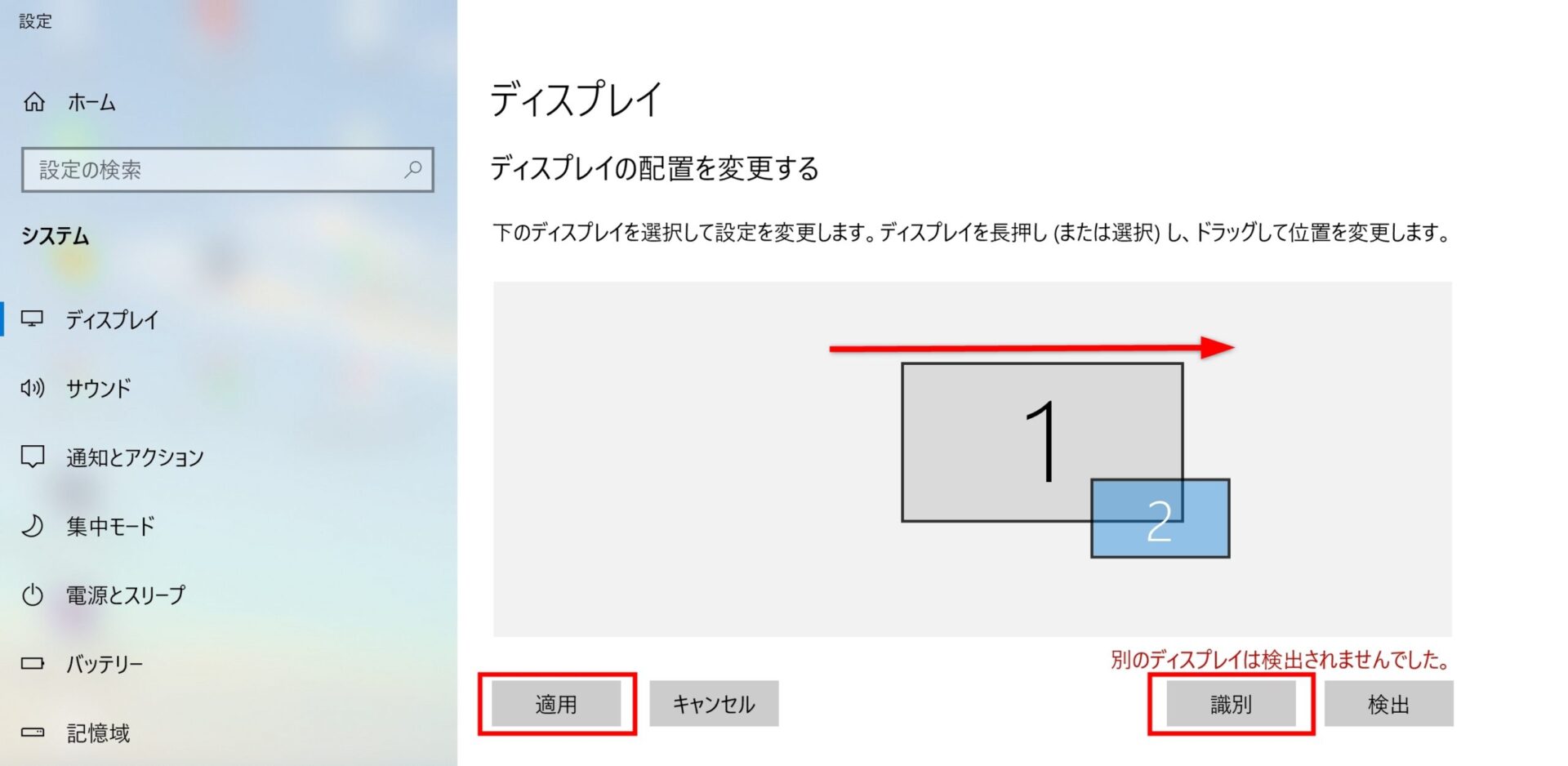 「ディスプレイの配置を変更する」設定の「識別」ボタンをクリックすると、各モニターに番号が表示されるので、モニターの番号アイコンをドラッグして、実際のモニターの配置に変えましょう。
