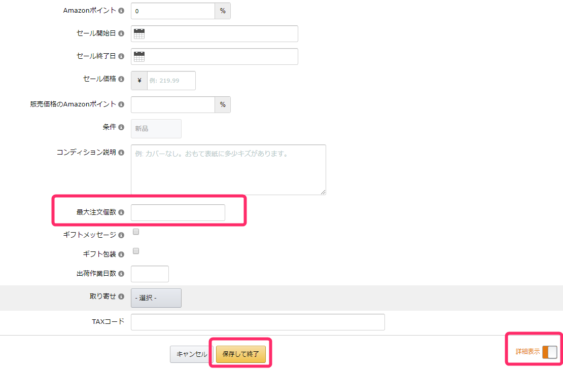 出品情報の最大注文個数を最小の1あるいは2にしてください。