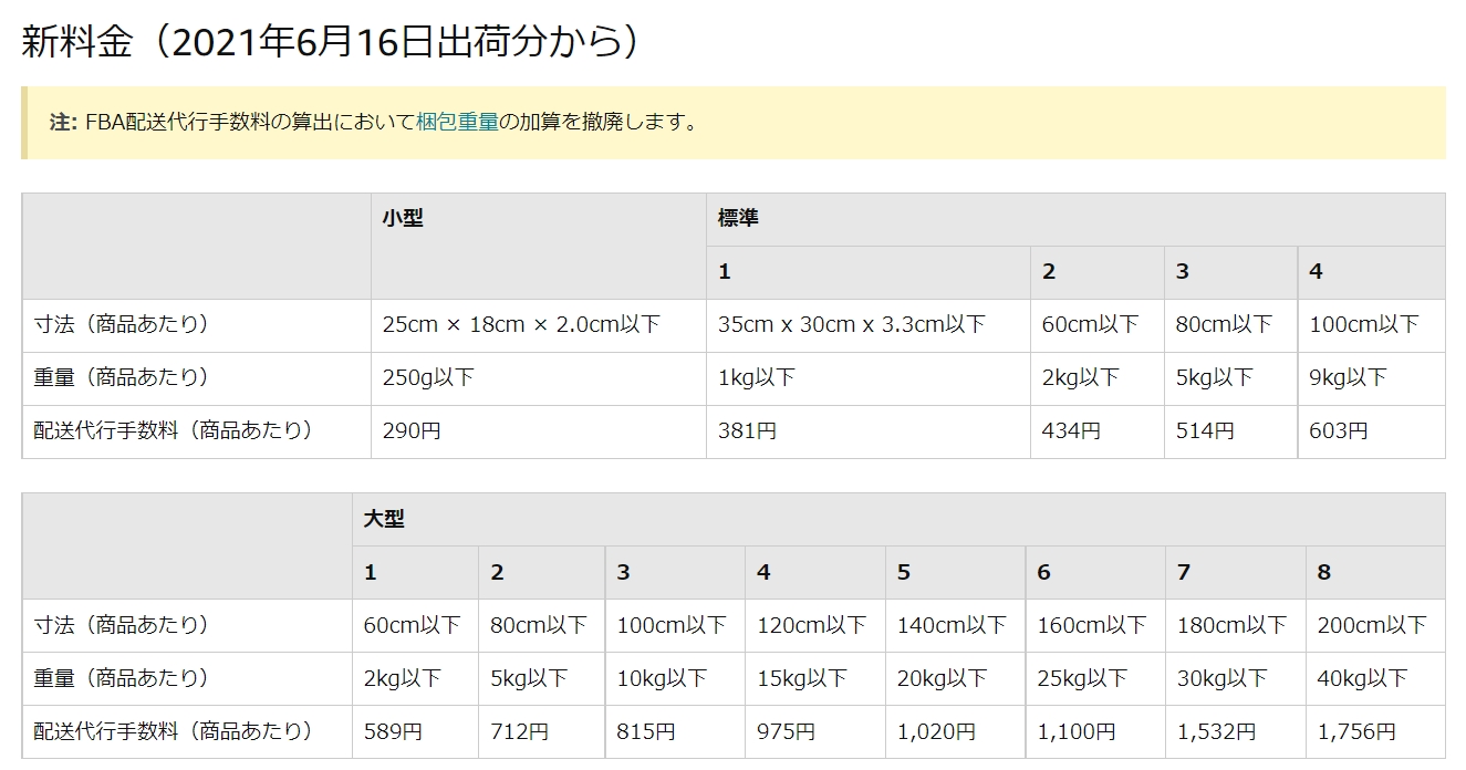AmazonのFBA配送代行手数料は寸法と重量によって異なります。