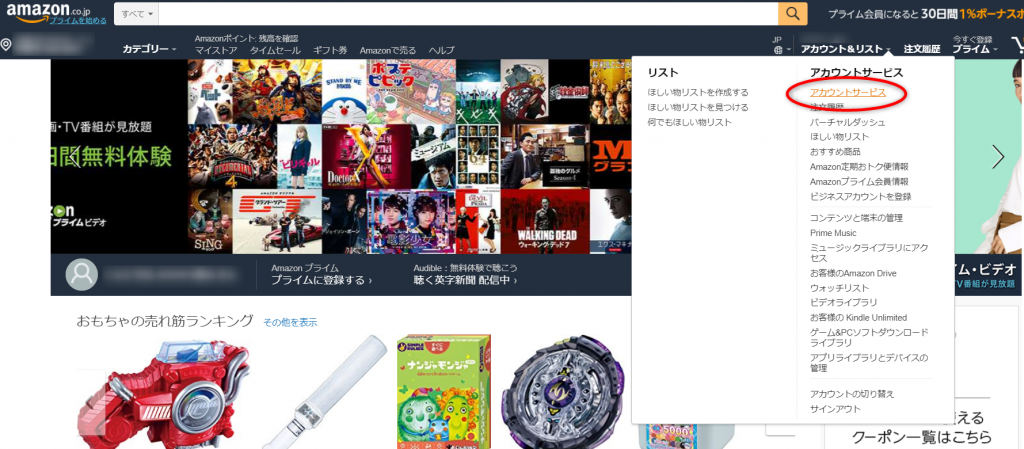 アカウントサービス画面が出ます。