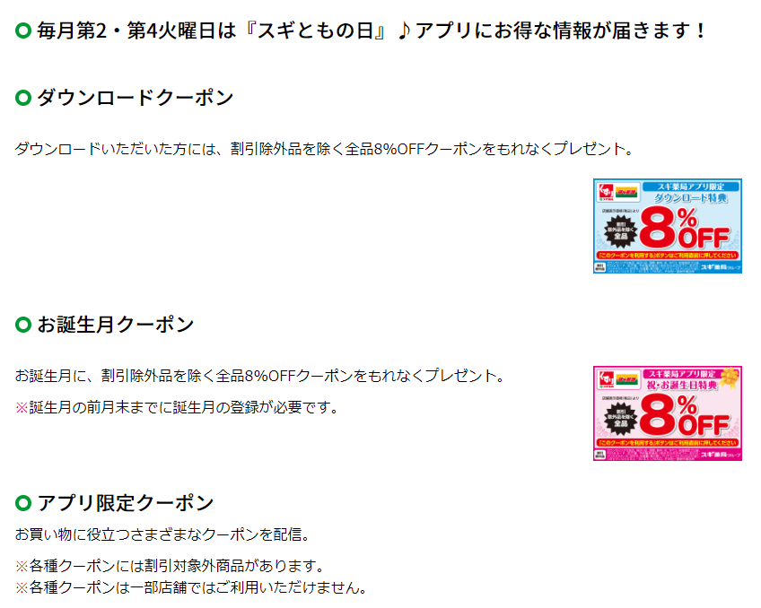 さらに、「スギともの日」である毎月第2、4の火曜日にお得なクーポンをもらえます。