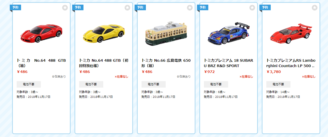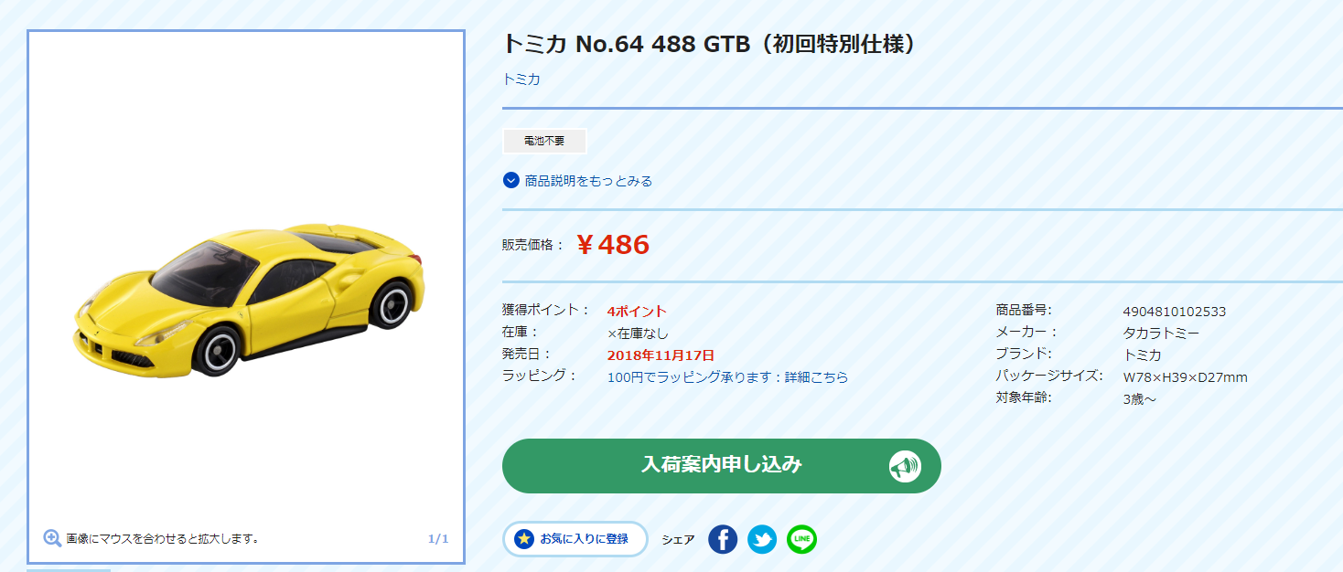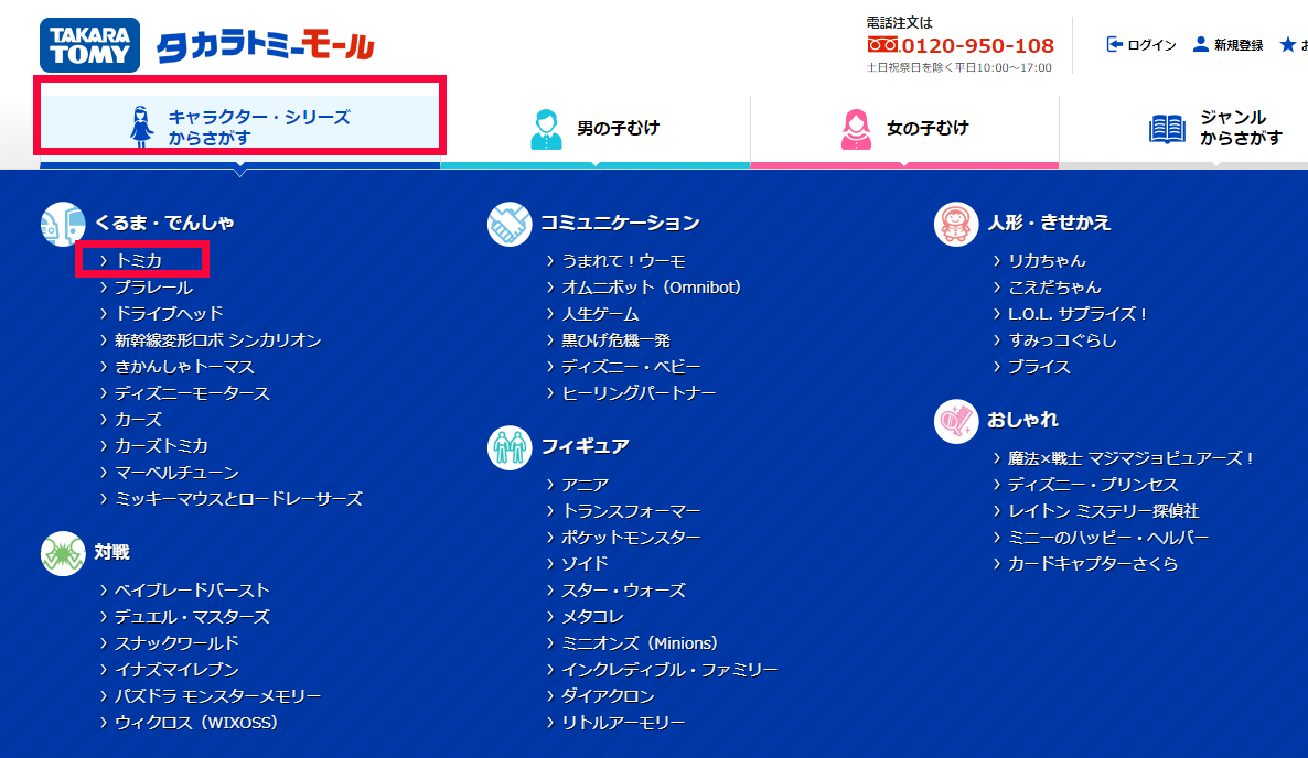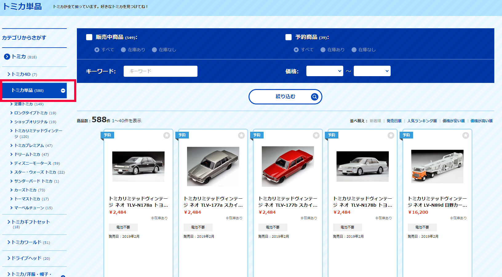 そして、左のカテゴリーのトミカ単品を押しましょう。