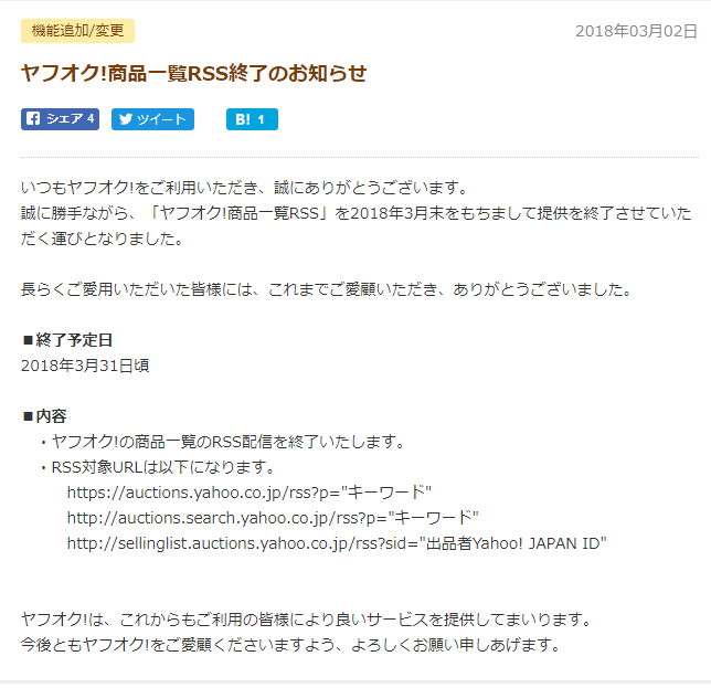 ヤフオクのRSS終了には、